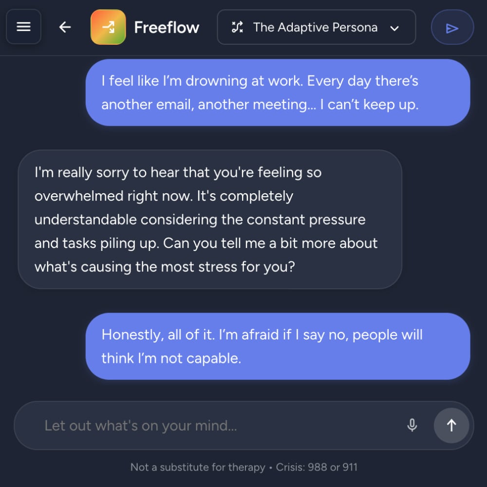 I was using ChatGPT to help me process, but it kept jumping to solutions when I just needed questions that'd help me get curious about what I was feeling first. I knew I needed professional help, but my feelings couldn't wait weeks for a placement.